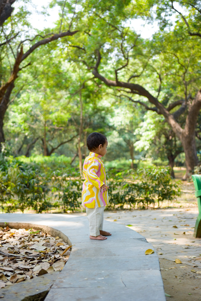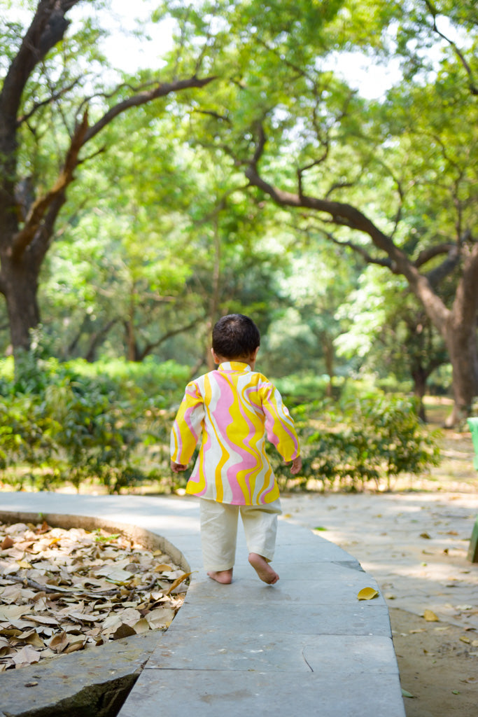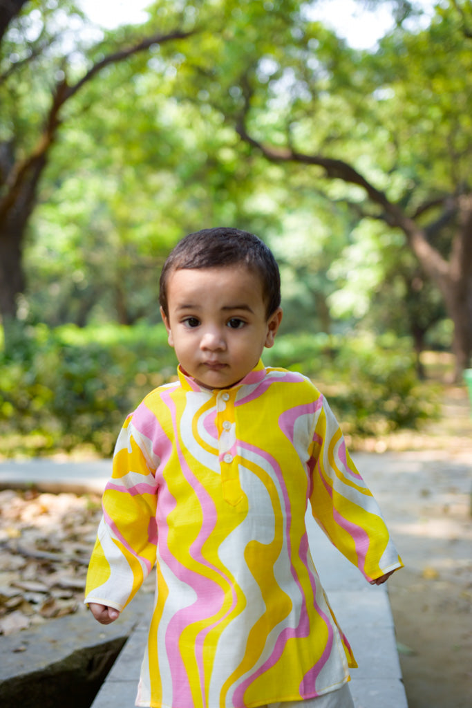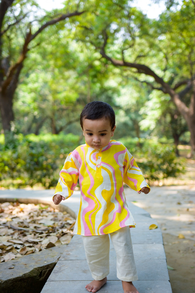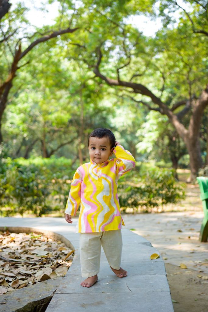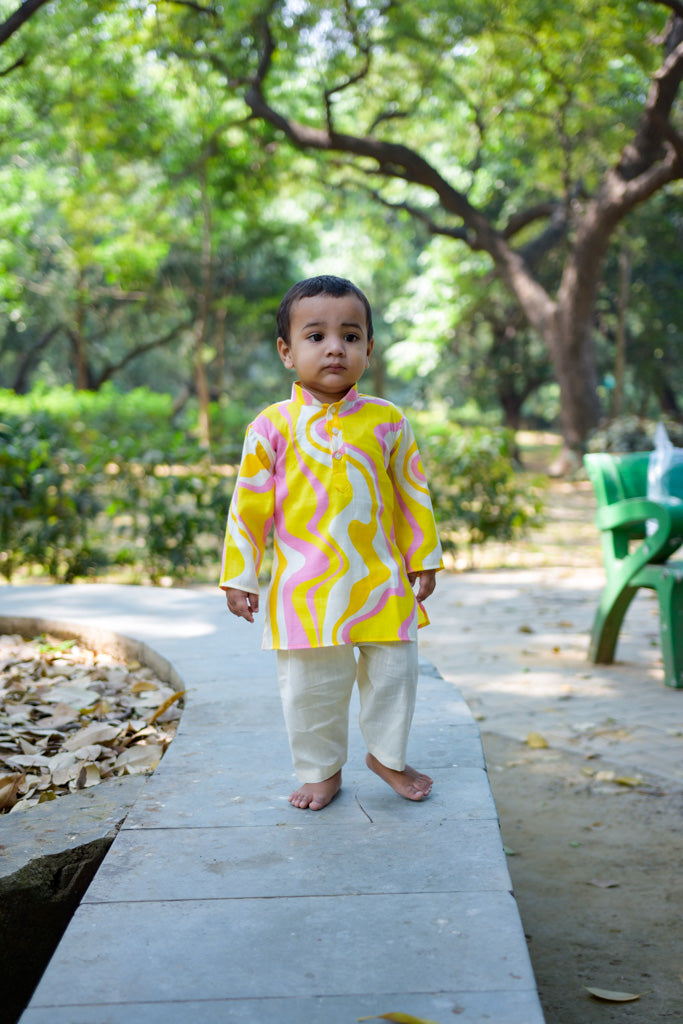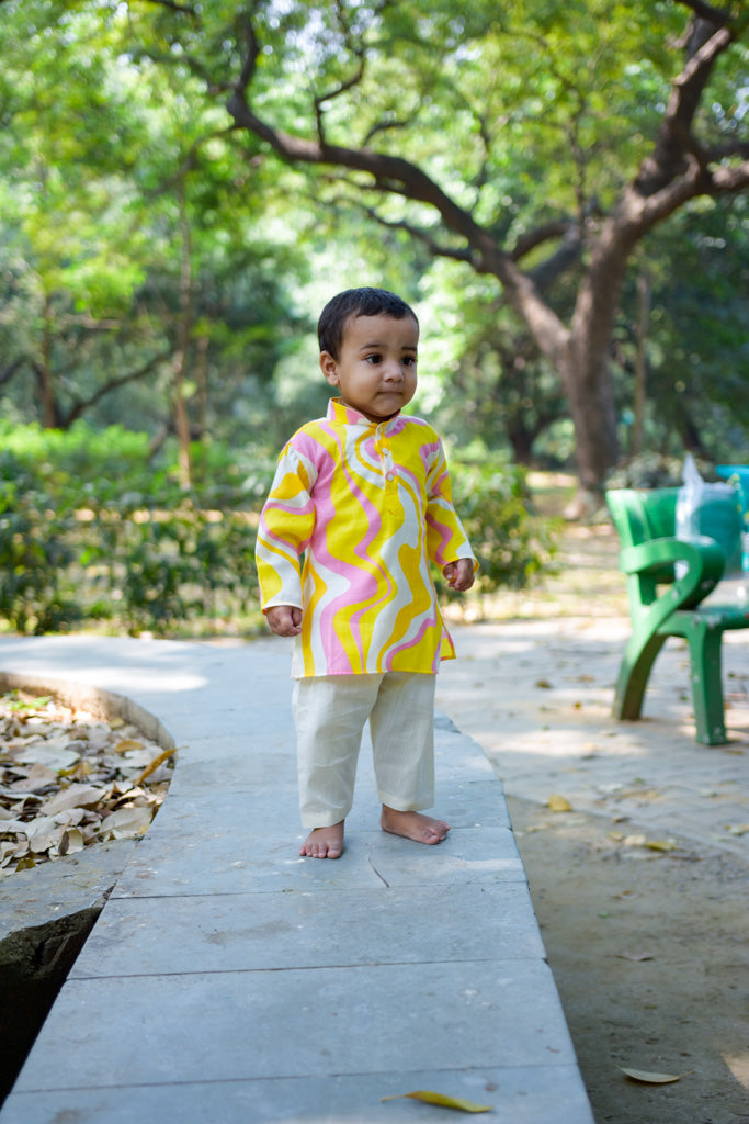 This ethnicwear set features a soft and comfortable cotton mix kurta paired with a lastic belt pyjama, to provide a proper ethnic look without any hassel. Soft and very comfortable for baby to wear day long